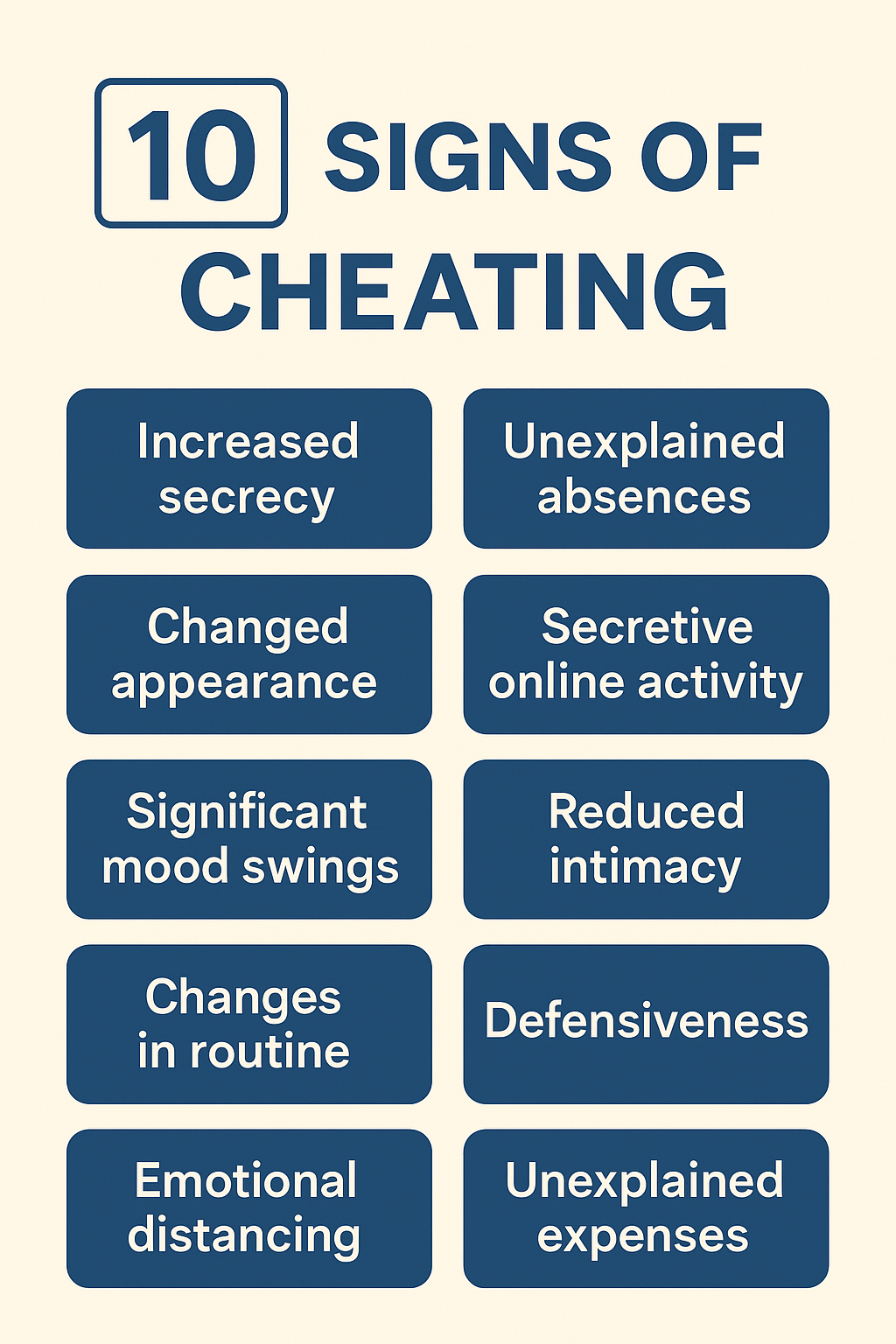 These behaviors are possible indicators—not proof—of infidelity: